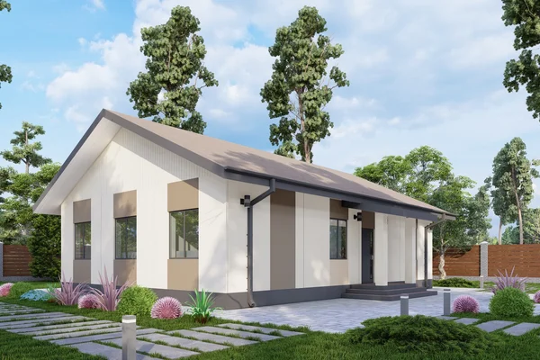 Современный одноэтажный дом с просторной террасой и панорамными окнами. Жилой проект в работе.